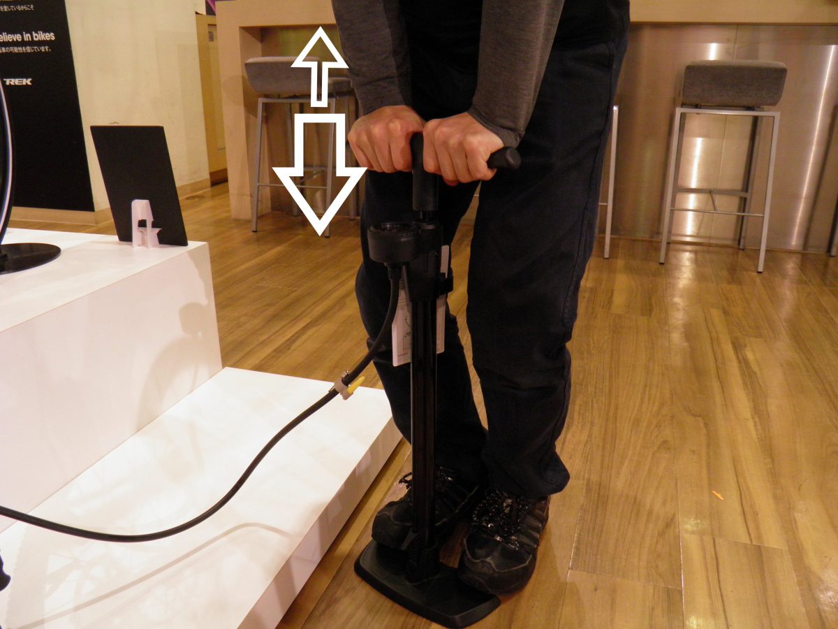 ポンピングはポンプのバーの上下動で空気を入れる操作です。ポンプのバーは下まで押し切ってください。細いタイヤのロードバイクやクロスバイクでは、高い空気圧まで空気を押し込むので慣れないうちは固くてなかなか押し切れないかもしれませんが、ポンプのバーに体重をかけてしっかり下まで押し切ってください。