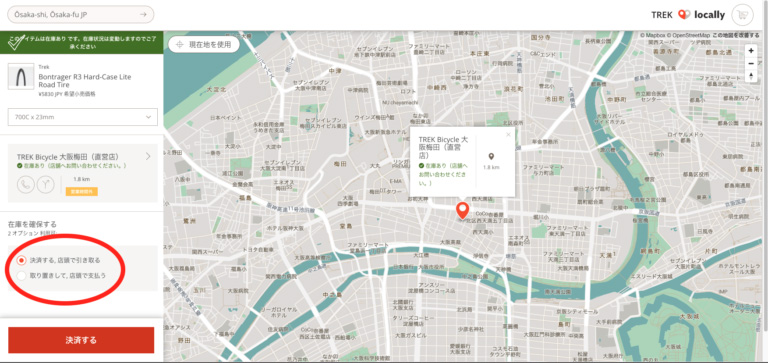 店舗を選ぶと、Locallyの画面が現れます。「取り置きして, 店頭で支払う」を選択すると、店舗に通知が飛び、実際に在庫があるか確認し、お客様用に在庫を確保します。