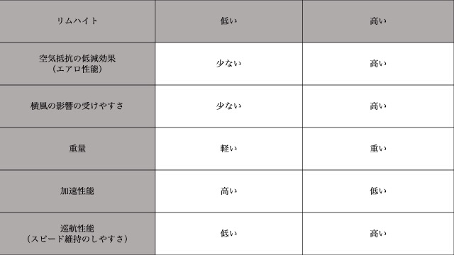 リムハイトと走行性能の相関関係をまとめると、下記のようになる。